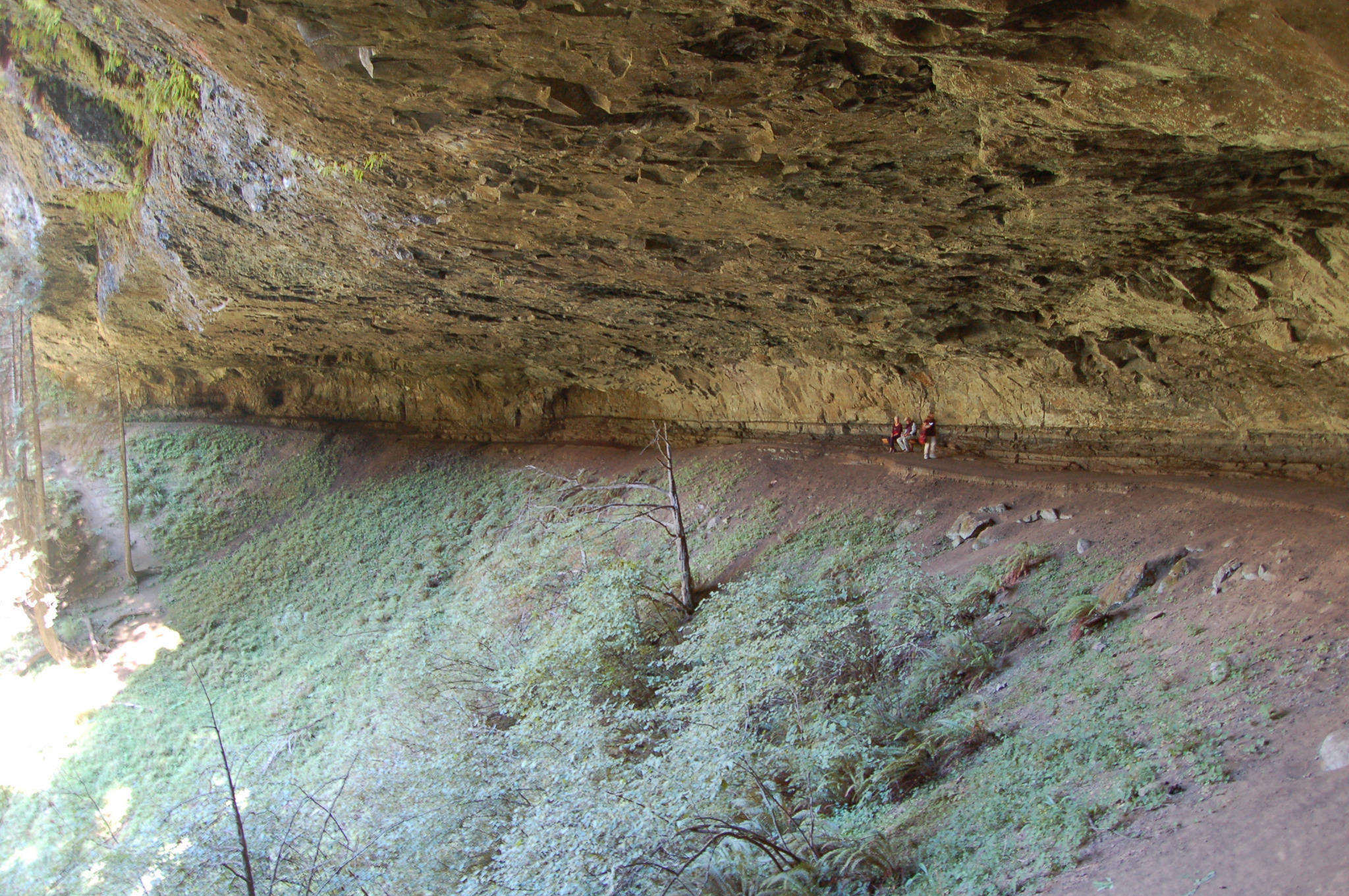 "Couple of Monday Geophotos: ledge of Grand Ronde Columbia River Basalt over seds, North Falls, Silver Falls SP, OR." (Note people for scale; this alcove is