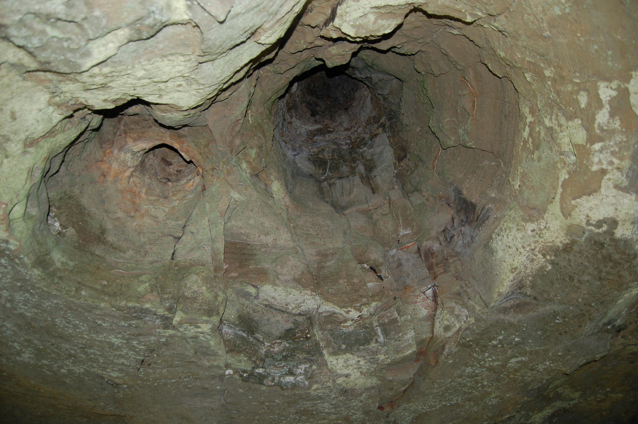 "#2, looking up from ~ where people are in 1st photo: tree trunk casts; trees growing in seds swamped by CRB flow." (North Falls, Silver Falls State Park, Oregon)
