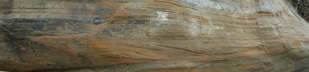 Looking roughly south-southwest along the base of Elephant Rock, we can see how the resistant Columbia River Basalt stands out, while the less resistant Astoria Formation is eroding back and undercutting it. Given the jointing pattern, it's predictable that sometime in the not-too-distant future, a substantial rockfall will bring down many tons of basalt, forming a pile of talus which, for a short time, will armor the sediments from further erosion. Then the cobbles and boulders will break up and be carried away by wave action, and the whole process will start over.
