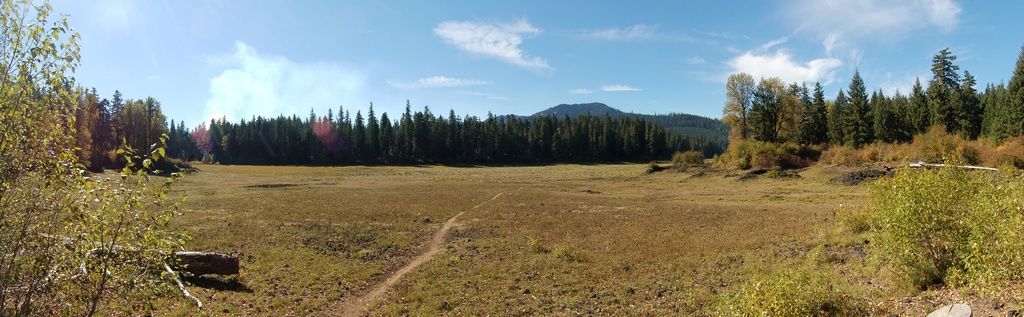 Here's a panorama of Fish Lake; it'll get much, much larger if you right click and open it in a new tab (Followup- it takes you to the Photobucket page..Hover your cursor over the upper right above the photo and select the "magnify" icon. Then right click, and select "view image." If it's worth the effort to you.) I discussed the geological details of this location in yesterday's post, and the context of lava flows blocking Hackleman Creek should be immediately clear if you look at the FlashEarth location below. The main thing to point out here is the smoke plume from a nearby fire on the left-ish horizon. With our dry summers, and to my impression, increasingly later fall rains, wild fires, viewscapes, and planning for them is something I take into account when deciding where to geologize. They're less predicable than tides, but easy to get details about as one makes plans for the near future. And like tides, if they're not taken into account, they can make a mess of your day.